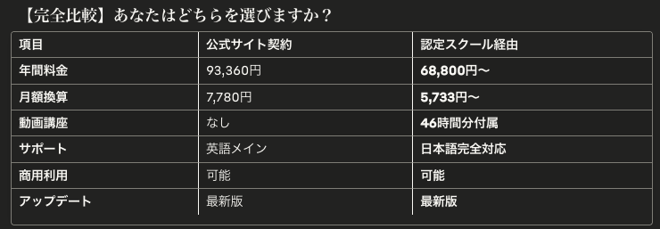 | 項目 | Adobe公式の価格プラン 93,360円/年 | Adobe提携プラチナスクールの価格プラン 68,800円/年 |