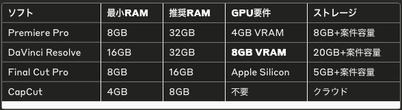 重要:4K編集には最低16GB RAM、できれば32GB推奨